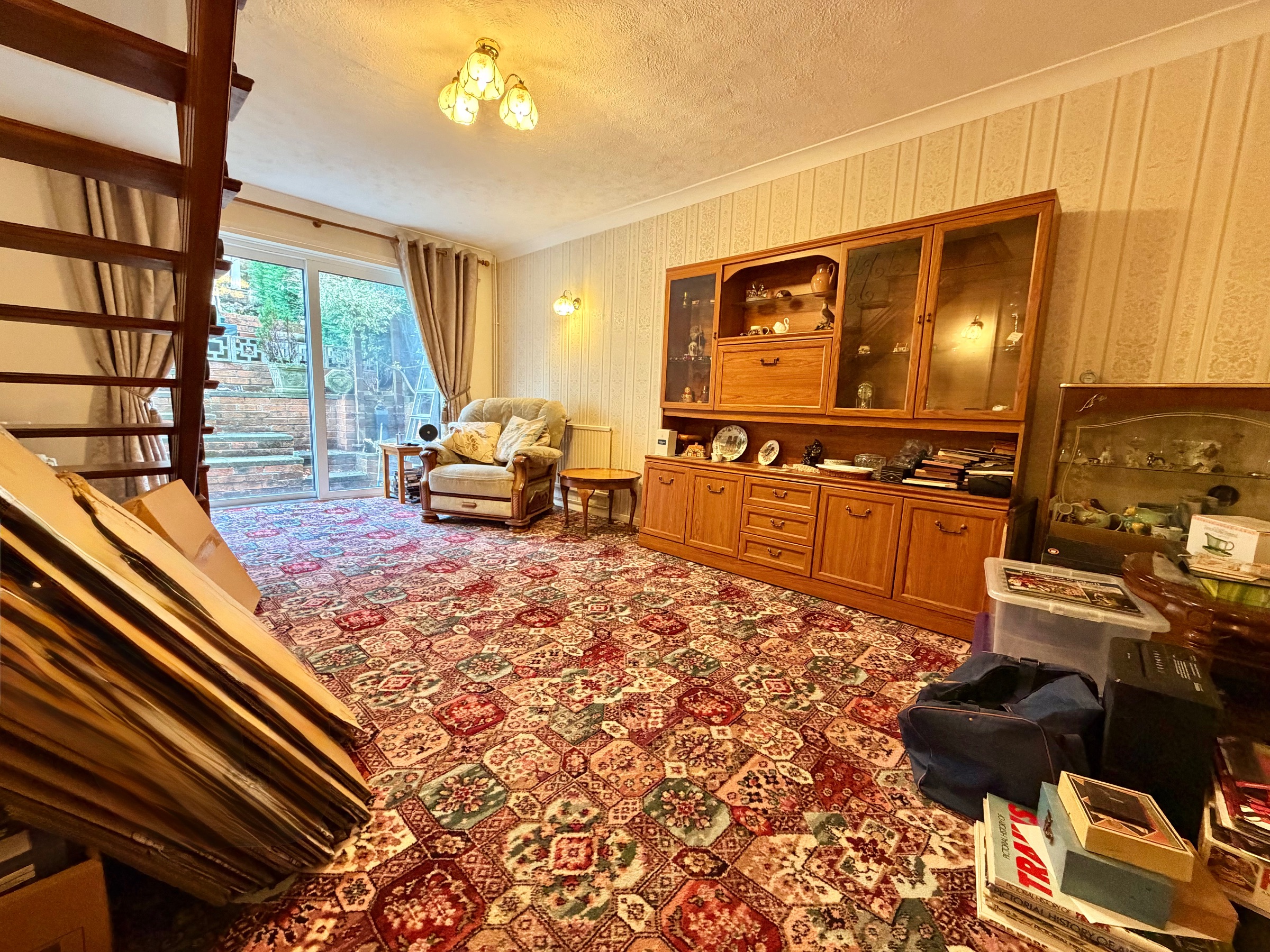 Could be utilised as a lounge or dining room. Carpeted flooring, radiator, doors leading out to rear, stairs leading up to first floor.