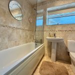 Bath with shower attachment, WC, wash hand basin, window to side aspect, fully tiled.