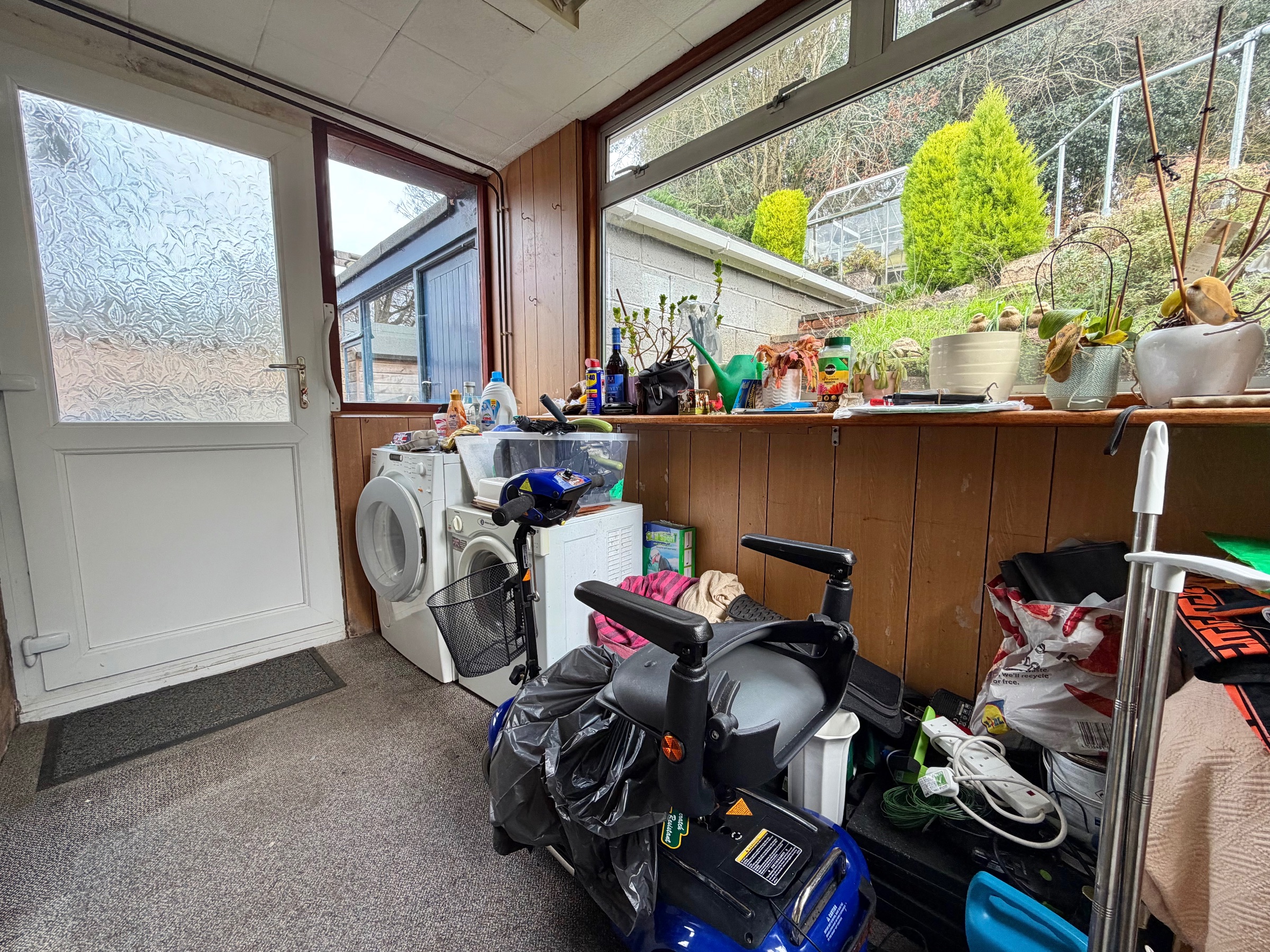 Currently utilised as a utility room. Windows to rear and side aspects, doors out to both sides, carpeted flooring, space for storage, space and plumbing for washing machine and tumble dryer.