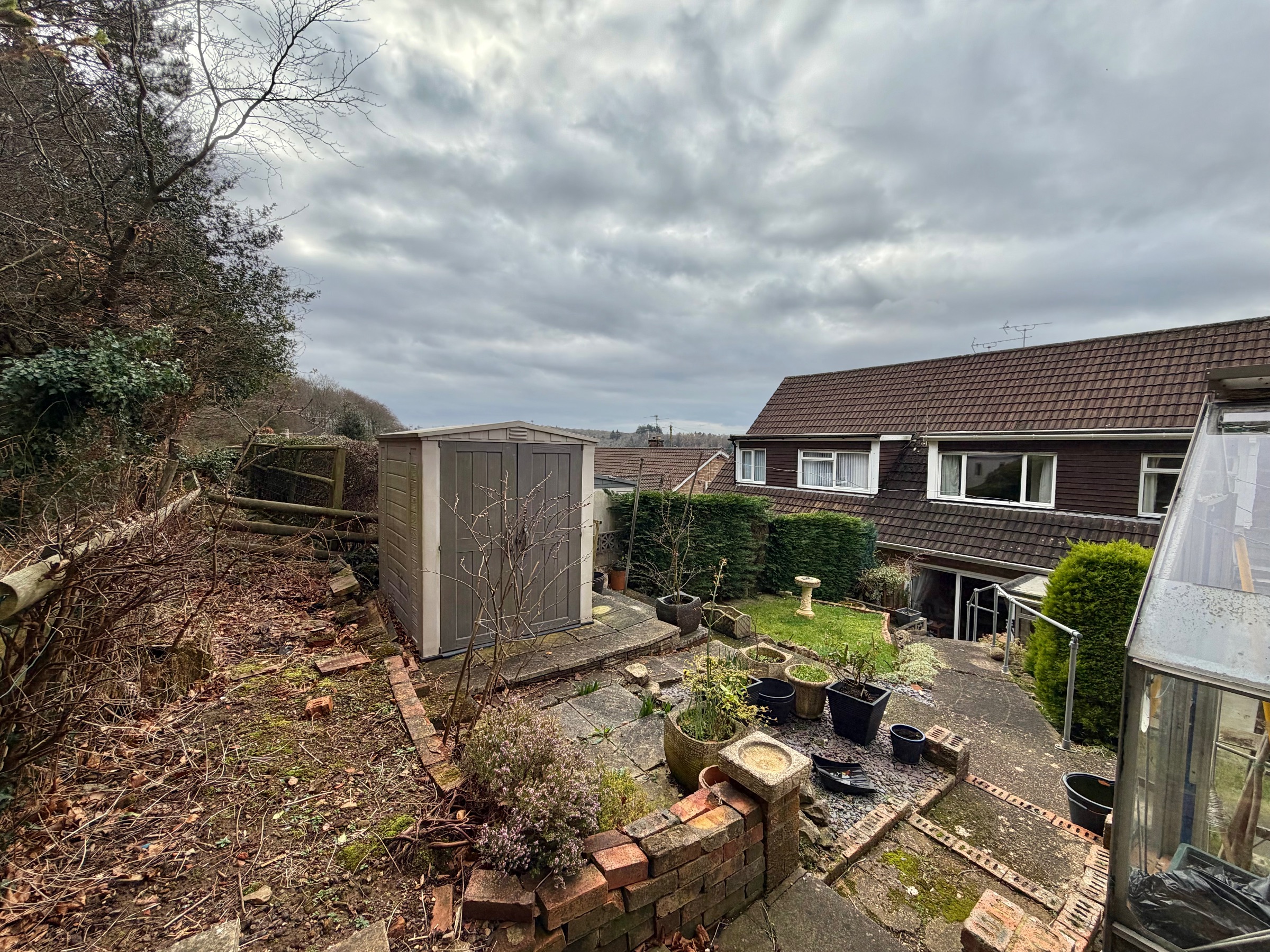 Externally, there is a lawned area to front with driveway to side. The rear garden has an outdoor storage room, shed, and greenhouse and the garden is tiered with steps leading up to the top.