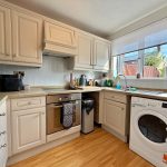 Fitted units at eye and base level with worktop space, integrated oven with electric hob and extractor hood over, sink unit with drainer, space and plumbing for washing machine/dryer, space for freestanding fridge freezer, tiled splash backs, window to front aspect, wood-effect flooring.