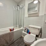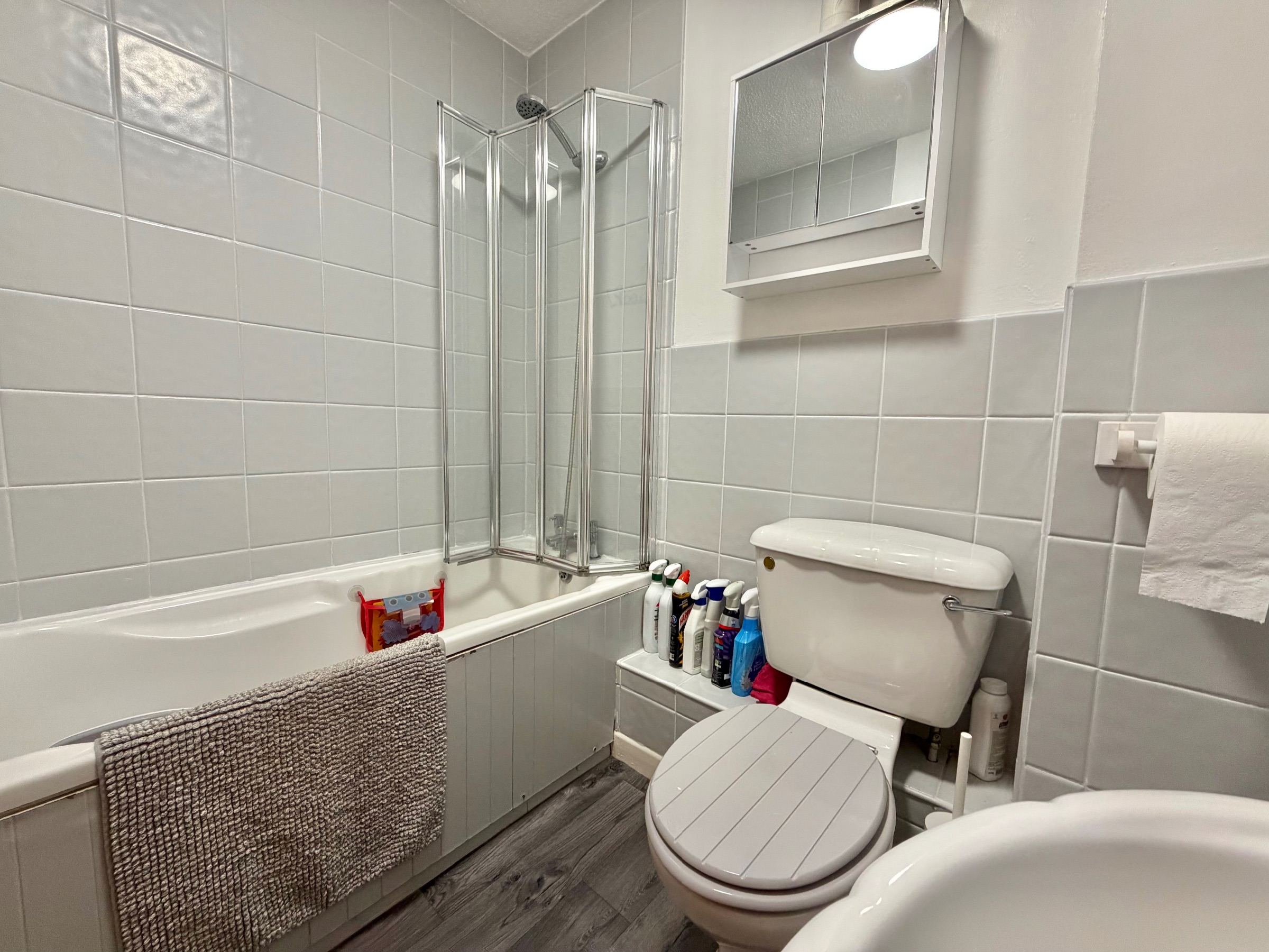 Bath with shower, WC, wash hand basin, tiled splash backs, wood-effect flooring.