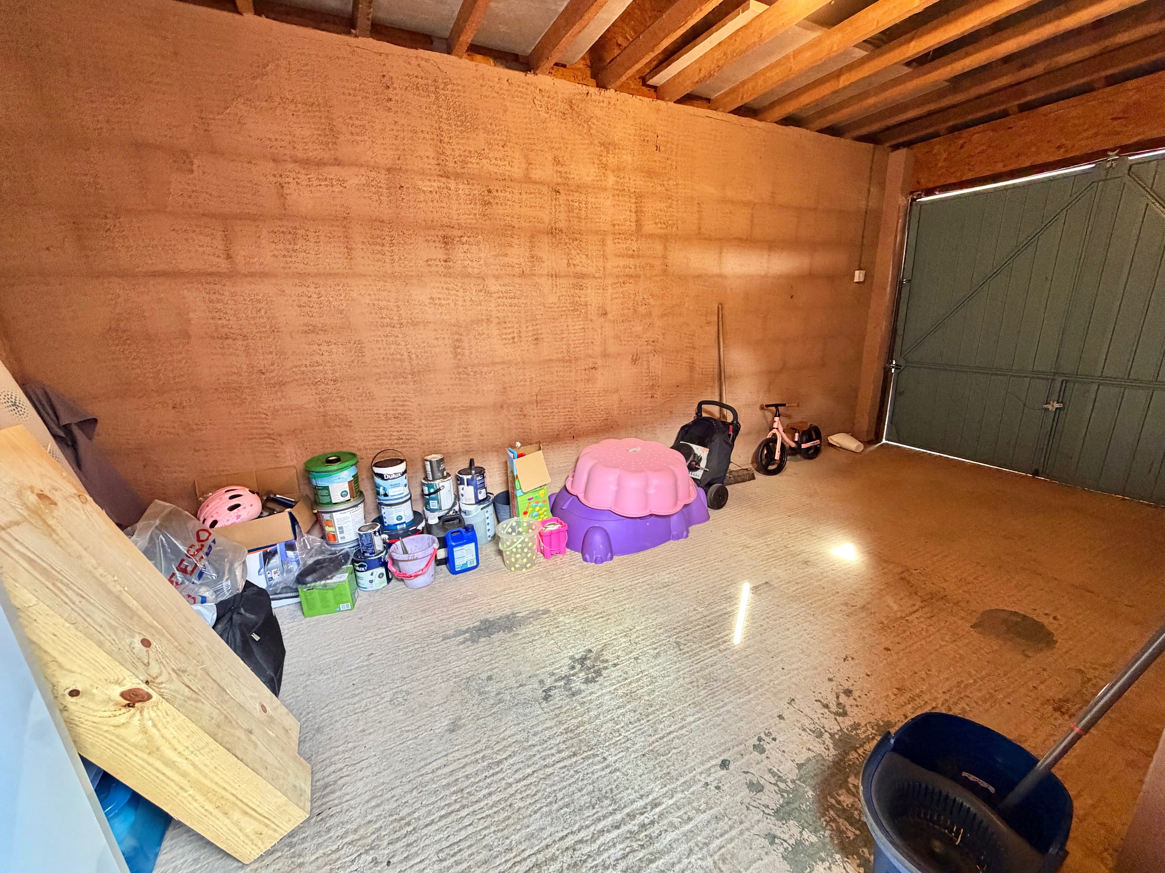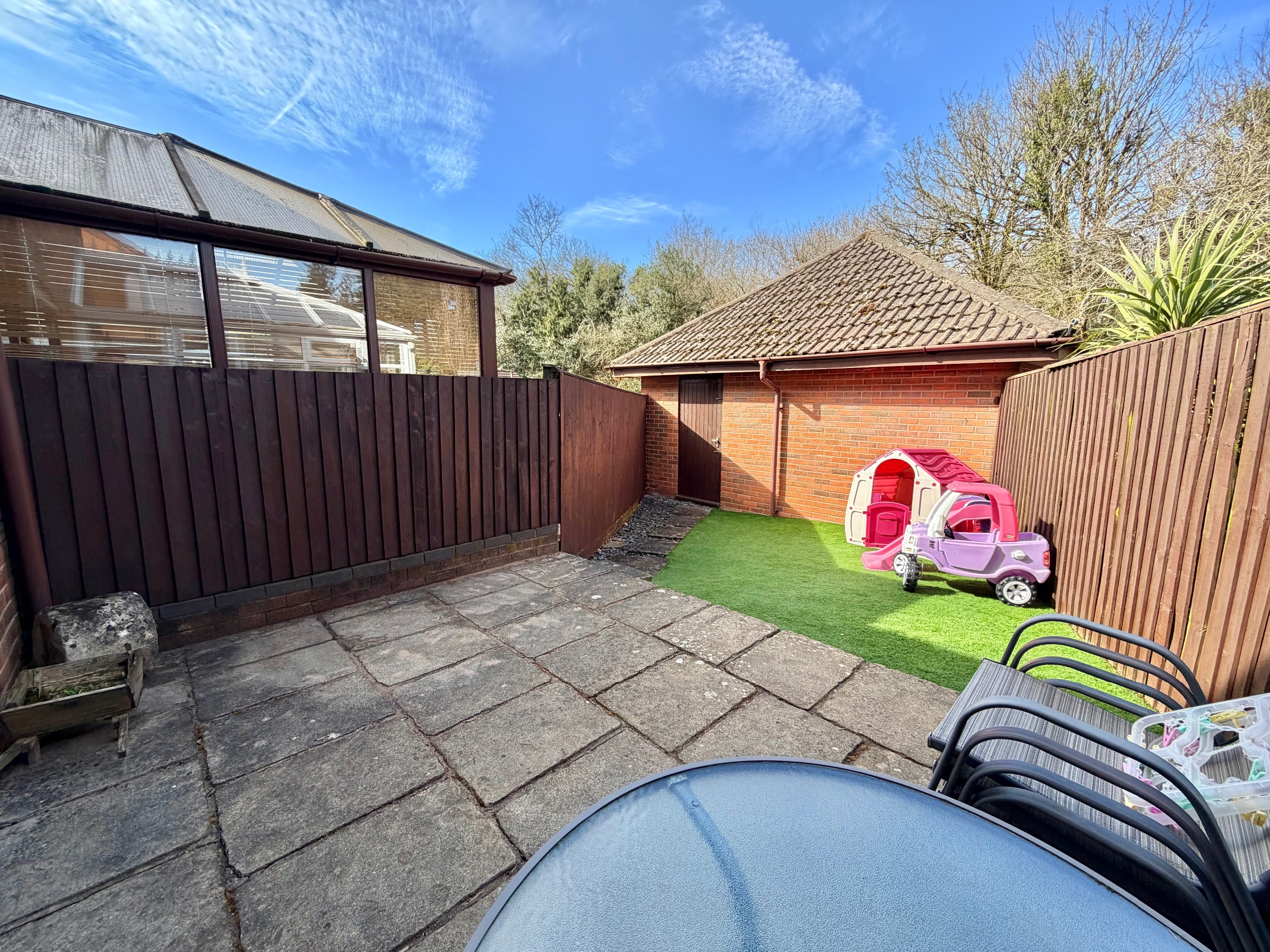 The rear garden is enclosed by fencing and laid to both patio and Astro turf, with a pathway leading up to the garage. The garage has a side door and front door and offers power and lighting supply. There is parking for one vehicle outside the garage.