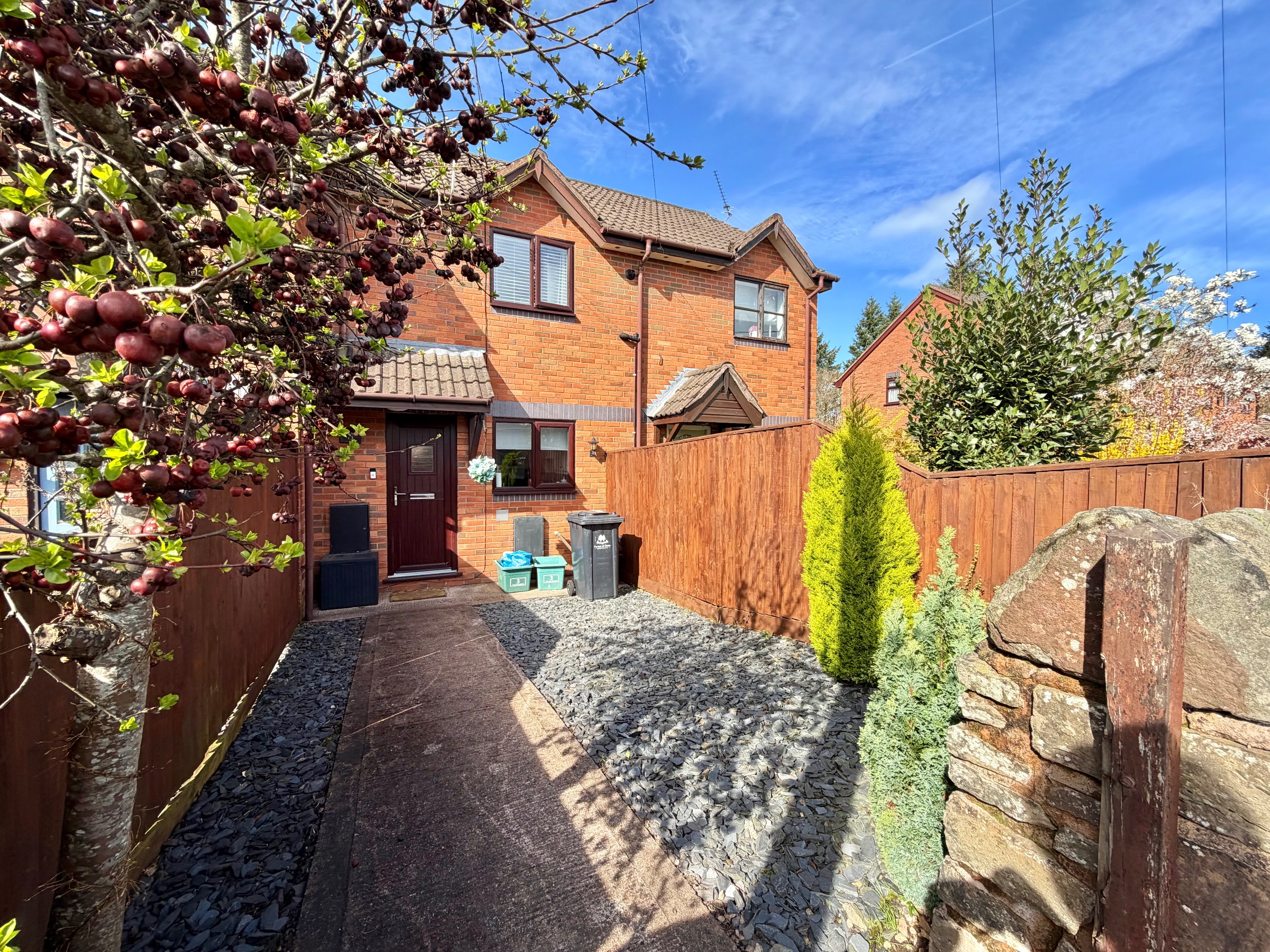 To the front of the property, there is a pathway which leads up to the front door, with low-maintenance pebbled areas to either side.